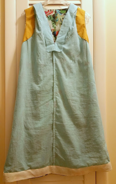 I knew I couldn't french seam the neckline or the armscye, so I stay-stitched those to keep them in good shape, and then carefully applied the facings that came with the pattern (I prefer facings to bias binding, so was happy to see those pattern pieces). I clipped and cut where needed, and after understitching, I pressed the facings to the inside of the garment, and handstitched the facings to the garment where needed to keep them from flipping out. The armscye needed handstitching the whole length on the outside, but the neckline only needed it in a few places. I may eventually handstitch the whole neckline facing, but for now it is fine.