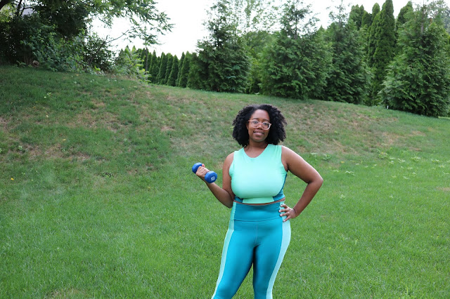 I used an existing pair of leggings and a crop top to create my patterns. I like keeping things simple, so I used some extra newspaper I had to draft my pattern pieces. I made a couple of modifications, by extending the size of the waistband and the length of the crop top. I also marked out all of the colorblock sections on my pieces and then cut them out on the fabric.