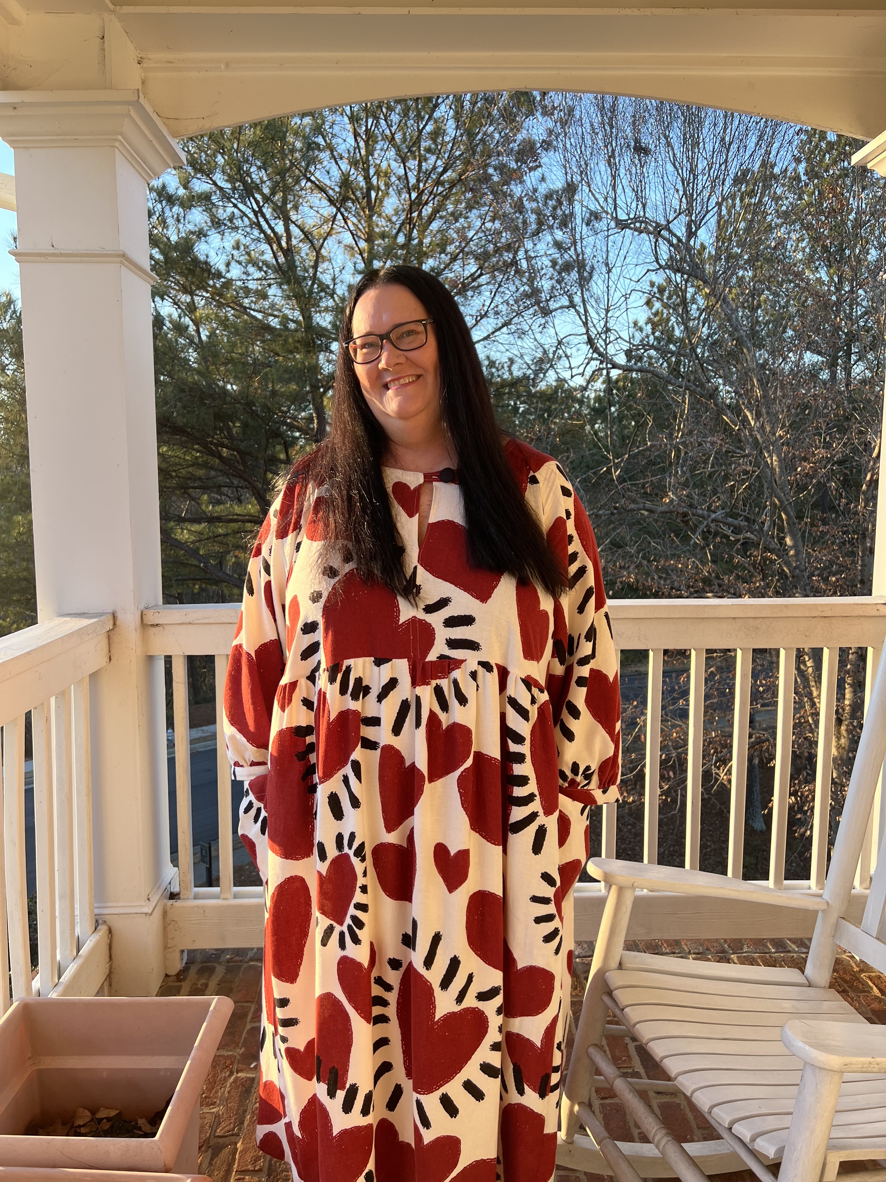 Hello sewing friends! I am so excited to share my new dress with you on the Fabricista blog for Fabric Mart today. My name is Patricia, and you can follow me on Instagram at @Hoppaheedahoe. I chose to sew the Sew House Seven Romey Gathered Dress and Top. I selected to sew the longest dress version (#3) in the Off-White and Cherry Red/Black Linen/Rayon Large Heart Print Shirt Weight woven fabric. I wanted to purchase this fabric almost a year ago and it sold out. I was so happy to see it was back on Fabric Mart's site.