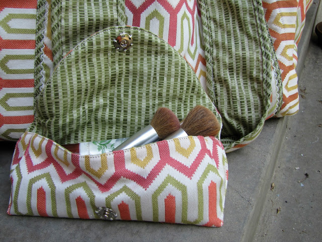 Home decor fabric is lovely to work with. I used two yards of it for the bag and enough left over to make a little matching clutch to use for whatever the lucky daughter or daughter-in-law likes. The colors are vibrant and the design is woven into the fabric. This is a nice, quality piece and not at all like some of the home decor fabric your great-grandmother may have used. These are modern prints with fun colors!